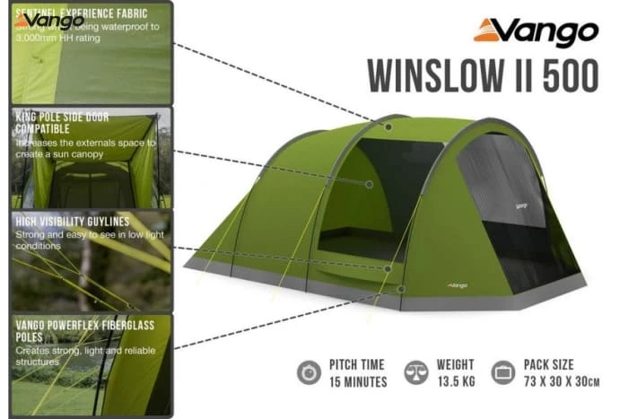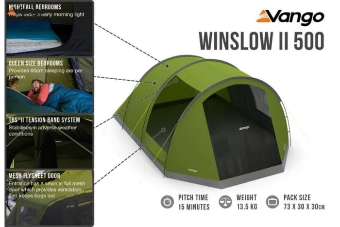 The Vango Winslow II 500, 5-man tent is a poled tunnel tent. Ideal for weekends away with the family or friends, the Winslow includes Nightfall bedrooms that reduce morning light, allowing you to sleep for longer. Add King Poles to transform the large front door into a useful sun canopy, providing much needed shade on hot summer days. The full mesh door and additional ventilation panels keep the air moving and reduce the risk of condensation.