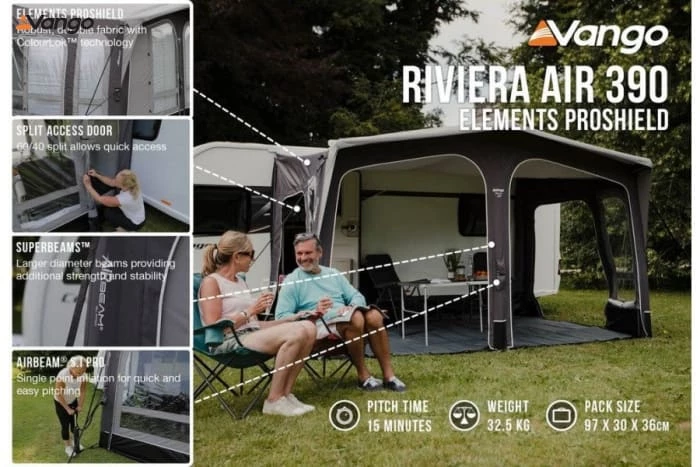 A classic design packed with practical features for a home from home feel wherever you go. Featuring Vango’s revolutionary AirBeam® S.I Pro single point inflation and Multi-Point Deflation, ensuring a seamless pitch and pack up every time. Created using durable Elements ProShield fabric ensuring your awning will stand strong against even rugged weather conditions and showcasing superior finishes such as Diamond Pro Windows for crystal clear views and enhanced insulation. With an optional annex to expand your space for storage or additional guests, there is ample room for all the family. Make the most of time together with the Vango Riviera.