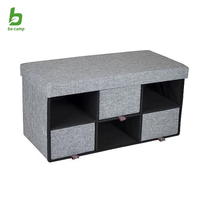 A stylish ottoman with six storage compartments and three drawers. It offers comfortable seating for up to two people.