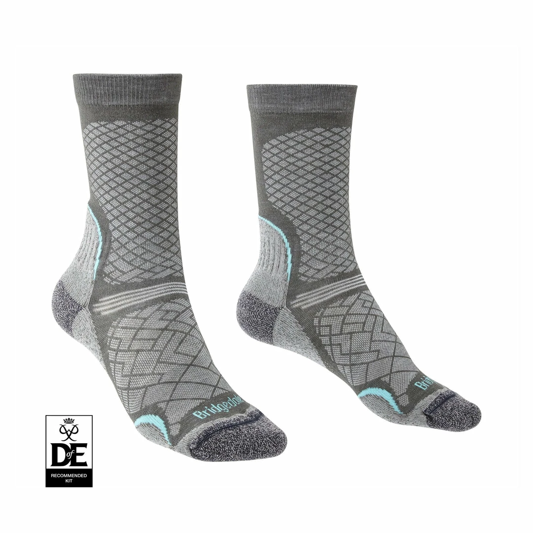 The ultra-light non-wool cushioned sock designed specifically for women is our lightest performance sock for hot weather adventure. The Hike Ultra Light T2 Coolmax® Performance ensures your feet stay cool, comfortable and dry when temperatures soar. Engineered advanced T2 zonal padding provides lightweight micro cushioning for comfort with minimal heat retention whilst the open mesh structure promotes easy moisture transportation away from the foot. Coolmax® Performance Fusion Technology provides outstanding moisture wicking, resilient T2 underfoot padding alongside durability the you would expect from Bridgedale. The Boot length allows moisture to wick out of the footwear and evaporate from around the leg and cuff whilst the Performance Fit is close, supportive and won’t slip down or bunch in your footwear. The Flat Toe Seam minimises bulk in the toe box and the sock is kept securely in place with an engineered Women’s Specific Fit, Elasticated Arch and 3D-shaped heel cup. Built on a structure of Lycra® and set by our Thermo Fit process ensures this sock returns to its original shape and size after every wash. This is the ideal choice for walkers, trekkers and travellers looking for comfort in warm, hot climates.