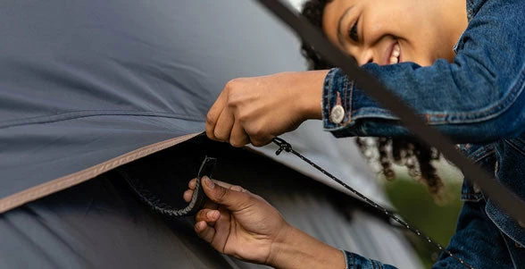 The attached bedroom sleeps two people, is extra-large and will comfortably fit larger airbeds. The bedroom includes a Polyester floor for a more comfortable feel and feature BlackOut Bedroom® technology blocking daylight, reducing the temperature during the day and increasing it at night, ensuring a more restful sleep.