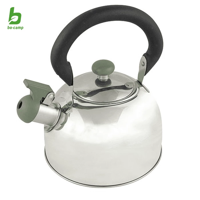 The Bo-Camp Trend 2 Stainless Steel Kettle Fold Away Handle 2.5 L has a sturdy bottom and extra compact due to the foldaway flute cap and hand grip. Ideal for travelling.