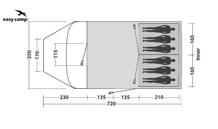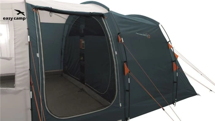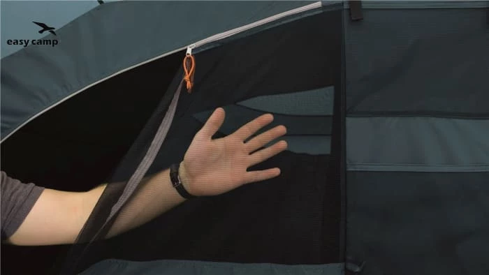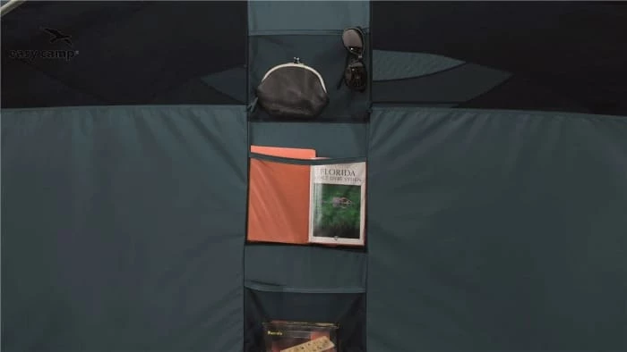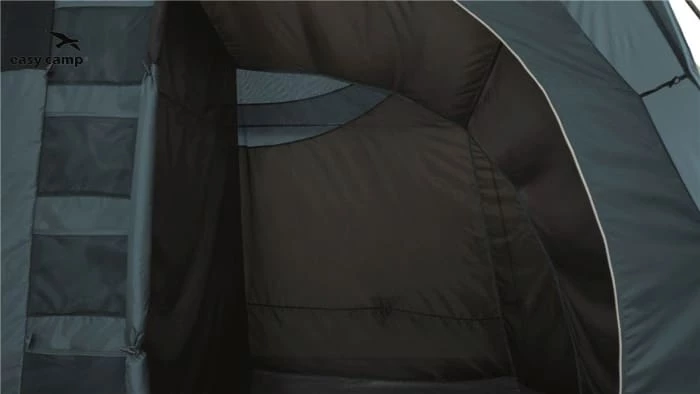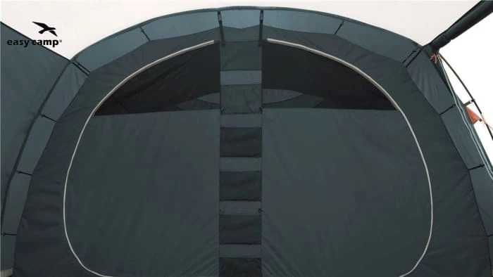 A solid 3,000mm HH waterproof rating is a great spec for the price point and as it has a sewn-in groundsheet the tent inside is sealed away from the wind and rain. Colour co-ordinated poles make it easy to pitch. The bedroom compartment is made from Easy camp’s sleep tight material to reduce early morning light and hopefully you don’t wake you when the sun rises. The inner also has storage pockets built into the tent to allow you to locate torches and phones in the middle of the night. Windows are located on either side of the tent to give a view outside and curtains can toggle up into place to provide privacy when needed. Covered ventilation panels are located behind the bedroom section at each end of the tent to increase airflow and help reduce condensation. A toggled inner divider splits up the bedroom section and can be easily removed to make one big sleeping space.