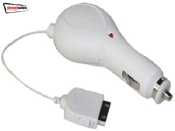 A 12/24V retractable cable charger. Suitable for selected iPhones and compatible iPods/iPads.