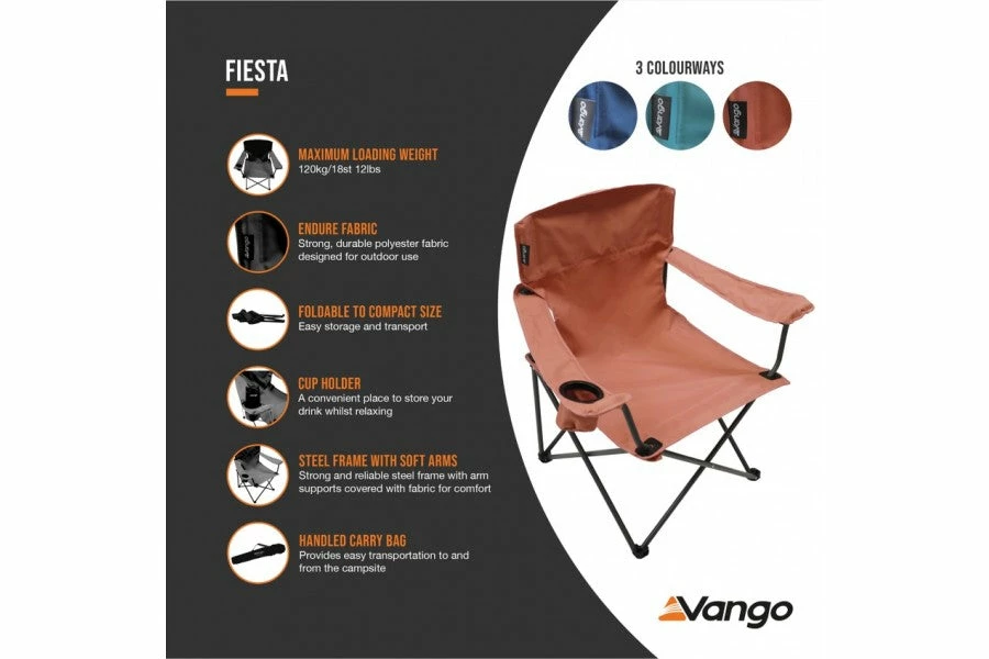 The Vango Fiesta chair is perfect for relaxing in the garden or on the campsite with a cold refreshment or hot chocolate, thanks to it’s convenient cup holder. The Durance fabric is strong and durable in the outdoors and features a comfortable padded seat and backrest, strong steel frame with soft arms and folds to compact size, making it easy to store and transport.