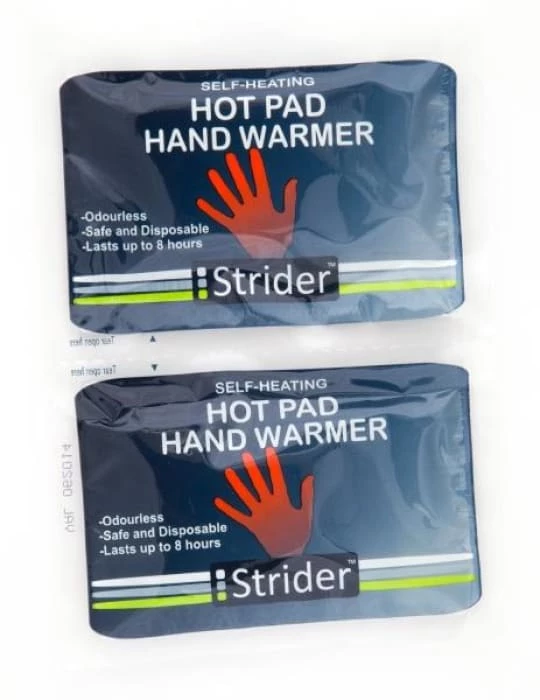 Self-heating hot pad hand warmers from Strider. Maintains a temperature of 50-55 degrees Celsius whilst active. Odourless, safe and disposable.