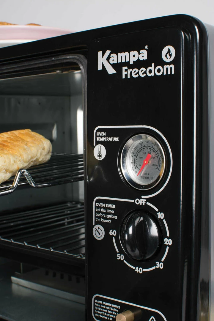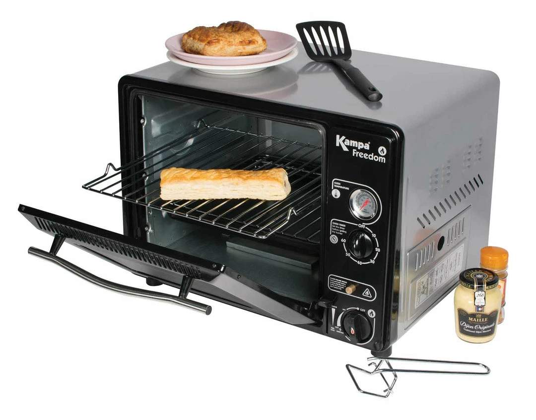The Kampa Freedom oven is cartridge operated so there is no need for large cylinder or regulator. It is powerful with a removable wire shelf and tray (1KW). You will get approximately 180 minutes cooking time from one cartridge.