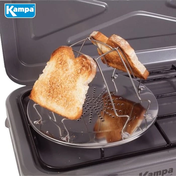 A Kampa toastie + gas stove = perfect toasted slices of bread in the morning. Can toast 4 slices at a time, using any camping gas stove. Simply folds down when being transported. An essential on every camping trip.Â