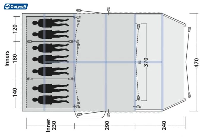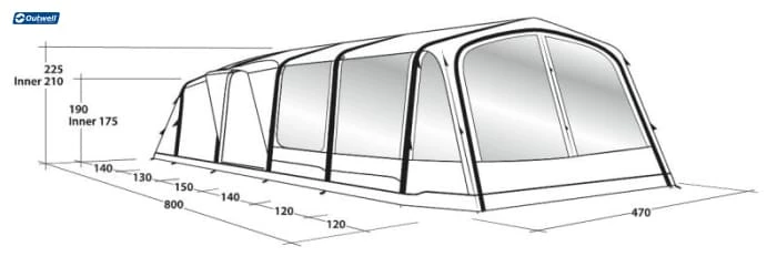 The Outwell Knoxville 7SA Air Tent has been updated for the 2022 season. The main update for the tent is the higher spec material: The Knoxville now has a 150D fabric which also has ripstop running throughout to give the material the next level of robustness. This – complimented with a 6,000mm HH – makes it one of the better Polyester materials on the market. This model still has Outwell’s Superior Air system which took over from their Smart Air System. You can now inflate each beam individually and you still have the additional roof bracers to give you that same stability the Smart Air gave you. This helps to make it is a lot easier to pack away as the air doesn’t get trapped anywhere in the tent.