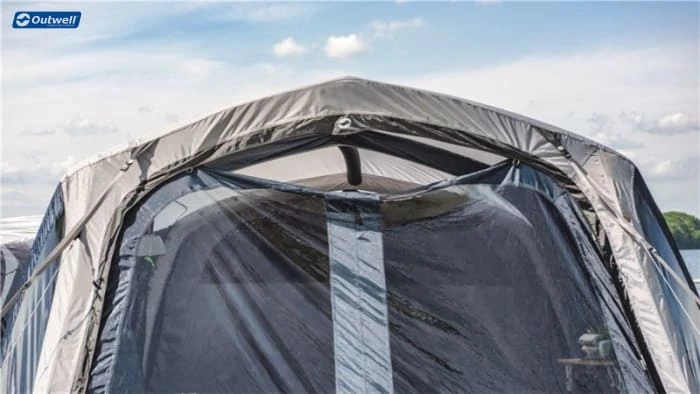 The internal height of the Lakeville is immense regardless of how tall you are. This is because of Outwell’s Gothic Arch style air tubes and well-designed floor space which makes the tent feel bigger than it is. Throughout the tent, there are beautifully large tinted windows which allow plenty of light to flood in while giving an element of privacy. Curtains are in place in every window to take that privacy to the next level and keep the sunlight from waking you up. The Dark Premier Bedrooms are now even darker thanks to the new colour and a darker material above the inner.