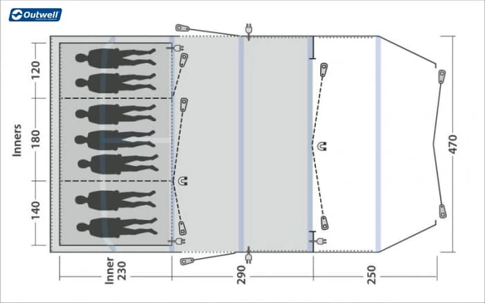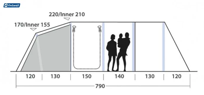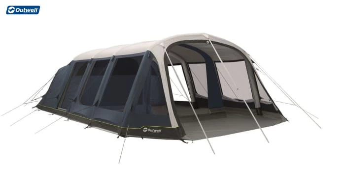 The 2021 Woodlake 7 ATC inflatable air tent. With Quick & Quiet Access, the Wood Lake 7ATC sleeps seven in three 230cm Ambassador Master Bedrooms with Dark Inners and Outwell Quick & Quiet Inner Doors. Pre-shaped air tubes ensure stability and ample headroom with steep sides maximising internal space over the durable polyethylene groundsheet. The Outwell Easy Access Front Door system opens fully, with a detachable tub-style groundsheet in the front zone, while the centre zone has an insect-proof mesh door.