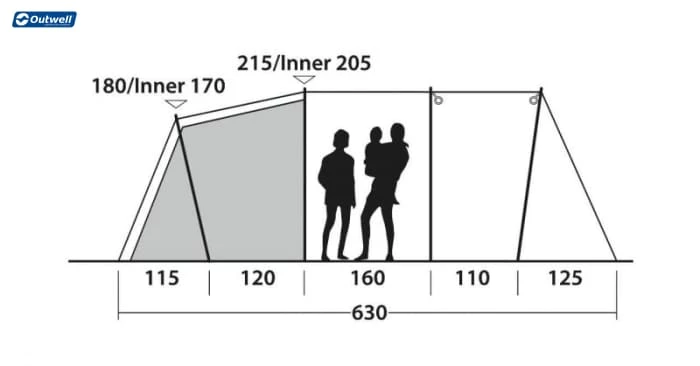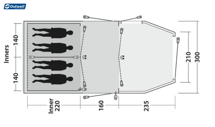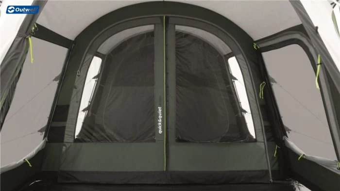 Not only does the tent come with high-vis guylines, but also ‘Storm Ties’ Velcro around the 19mm steel poles to make sure the fabric and poles are tensioned together, while storm straps are provided front and back to increase stability. Outwell have really gone to town on including things like their own HookTrack System to give you the option to have a hanging point for lights or storage pockets throughout the tent. ‘Quick & Quiet’ Access doors are located on the bedroom compartment and the living room door. Premier Bedrooms which are nice and dark and have a Rear Ventilation System built in to increase the airflow and help reduce condensation (this can be covered to keep the bedroom nice and dark if needed).