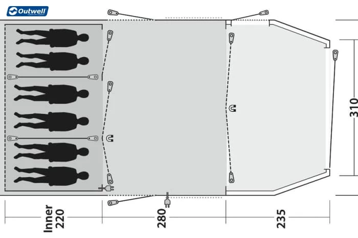 The Yosemite 6TC has 3 separate living areas including a large rear bedroom that is split into a 2+2+2 which also has zip dividing curtains that can be opened into larger combined bedrooms for a more luxurious setting. the bedroom has mesh pockets, Cable entry point and utilizes the Quick and Quiet entry magnetic system only found on Outwell tents.