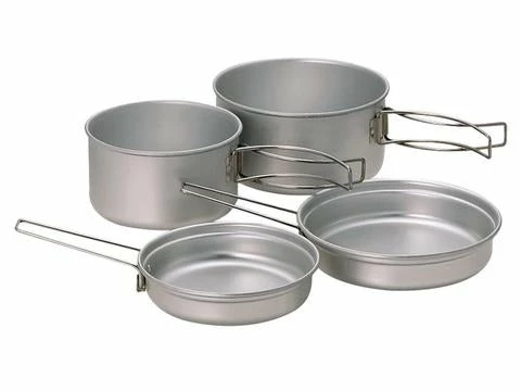 This aluminum cookset seeks to provide more compactness with out the loss of capacity. Its low profile design allows a compact solution for stacking two sufficiently sized pots with fry pan lids.
