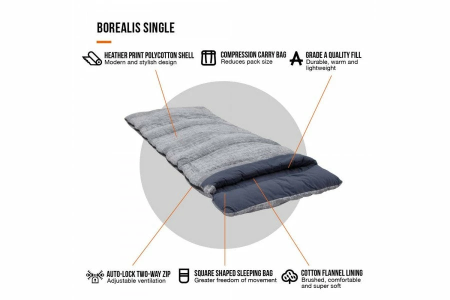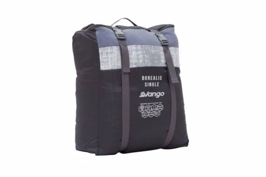 New for 2021, the Vango Borealis Single sleeping bag has been designed for those looking for a summer bag with small pack size. This square shaped sleeping bag benefits from ThermoLock Pro insulation, increasing durability and loft, keeping you warm and comfortable on warmer nights. Made with our luxurious cotton flannel lining and Heather Printed Polycotton Shell, the Borealis will be your go-to every summer.