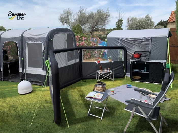 Inflatable windbreak with 1 point inflation for easy and fast to set up. The Air windbreak can be used independently or placed in front of an awning to create a completely closed space, which is ideal if you have a pet. Supplied with a storage bag, manual pump, guy ropes and ground pegs.