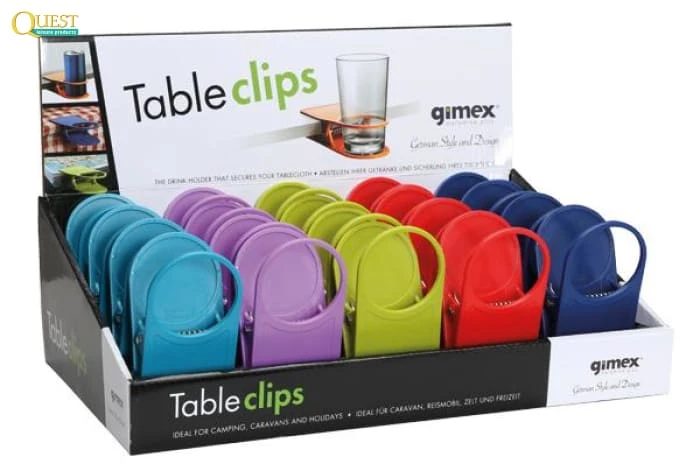 A premium quality table clip that can be used virtually anywhere!! Not just on tables. These clips are brightly coloured making it easier to identify which one is yours when used together with others. These clips are perfect for holding cans, cups, mugs and other items. It not only holds your drink but when used on a table also holds a tablecloth in place as well, great when used outdoors as it stops the tablecloth being blown around. The clip can be used on so many different surfaces, objects, tables, chair arms and so much more. Although purpose built to hold drinks the versatility of this clips means you’ll soon be using it for multiple other jobs, such as hanging papers up and so much more.