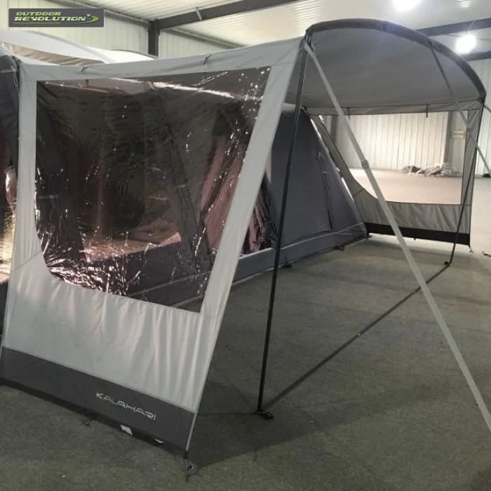 The Kalahari Steel Side Veranda Canopy zips onto the left hand side of our Kalahari PC 7.0 family tent, creating a brilliant porch extension on the left hand side. Increasing usable utility space, whilst retaining a panoramic outlook of the great outdoors, two expansive tinted side windows, as well as protection against the elements, to maximise enjoyment throughout wet weather conditions, as well as summer camping trips. This canopy extension is supported by a robust powder coated steel pole frame, utilizing flexibly robust construction, in order to maximise stability, longevity and durability. Each of the side panels can be rolled up to transform this porch area into an open canopy during summery weather.