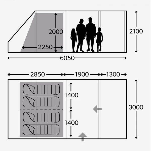 - Zipped inner divider – Offers greater privacy between inner bedrooms. Roll away when not required