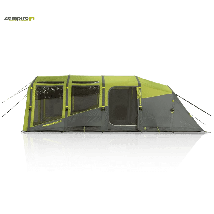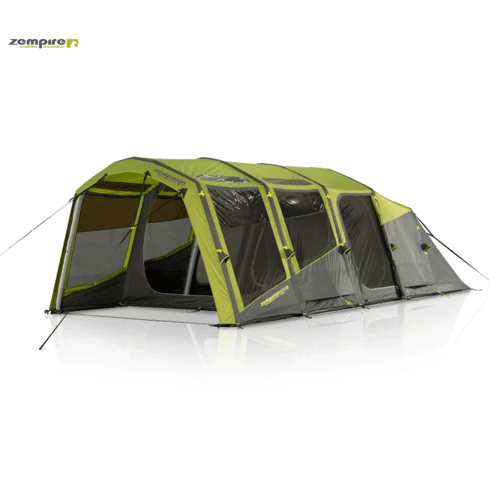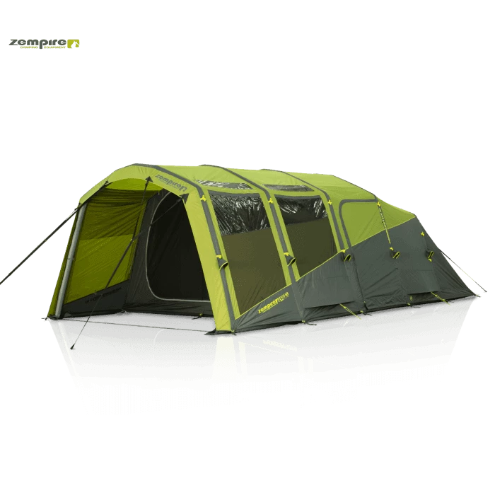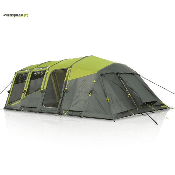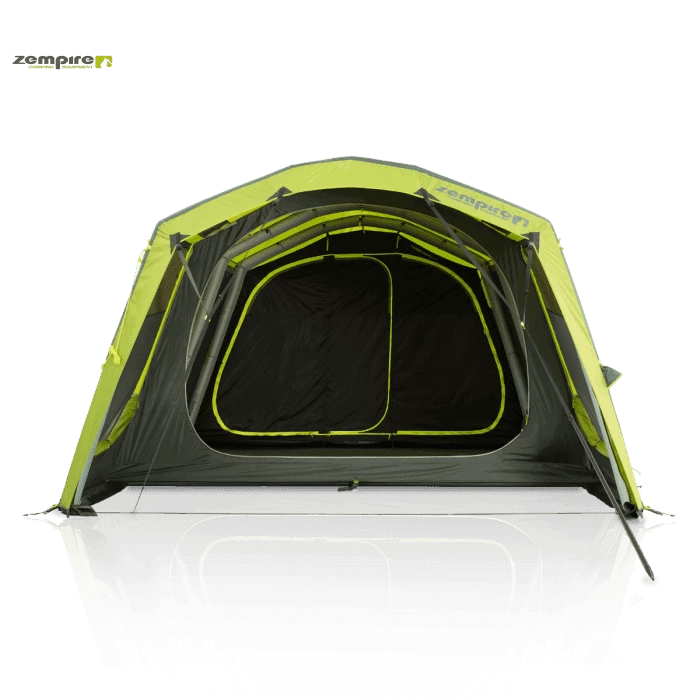 Zempire’s Sero-Link AirFrame System gives all of the structural strength of an Inflatable tent but without the bulk and weight. This is achieved by inventing a revolutionary new way of keeping the inflatable tubes in the tent. The open canopy on all of the Evo’s can be enclosed by purchasing the additional Front Awning Wall Kit. The kit is a window panel that has two side doors built into it, a full-frontal mesh door and some king poles. Both the front door and the mesh door can be attached at the same time giving the option to have the tent how you like it. The mesh door can be zipped on and left in place while the main door (which is in front of the mesh) can then be made into a Canopy (Gullwing Door) with the king poles included in the pack.