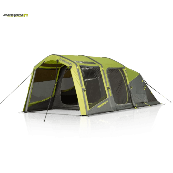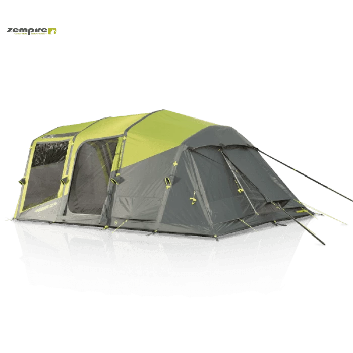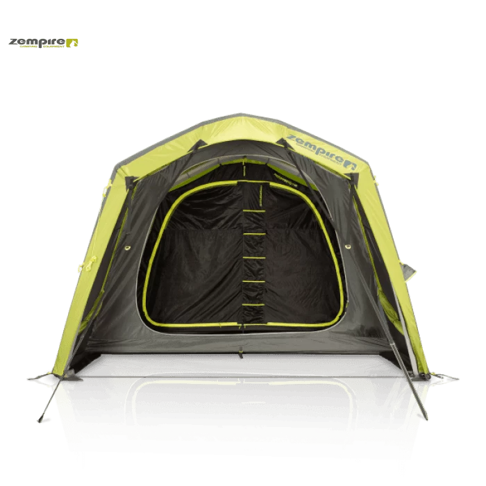 Zempire’s Sero-Link AirFrame System gives all of the structural strength of an Inflatable tent but without the bulk and weight. This is achieved by inventing a revolutionary new way of keeping the inflatable tubes in the tent. The open canopy on all of the Evo’s can be enclosed by purchasing the additional Front Awning Wall Kit. The kit is a black panel that has two side doors built into it, a full-frontal mesh door and some king poles. Both the front door and the mesh door can be attached at the same time giving the option to have the tent how you like it. The mesh door can be zipped on and left in place while the main door (which is in front of the mesh) can then be made into a Canopy (Gullwing Door) with the king poles included in the pack.