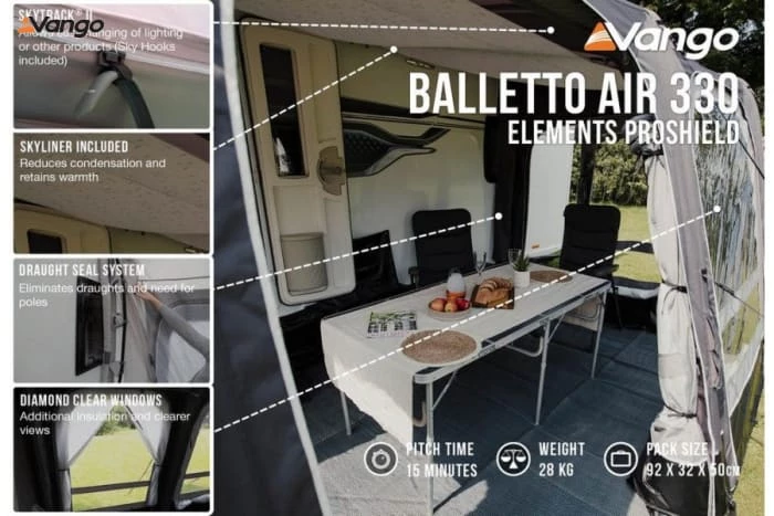The perfect setting for unwinding on the campsite. The Balletto Air 330 featuring Vango’s revolutionary AirBeam® Single Point Inflation and Multi-Point Deflation makes for a brilliantly quick pitch and pack up, leaving you with more time to enjoy your time away. Take in all-round views and enjoy the outdoors from the comfort of your awning with the large Diamond Pro Windows or adjust the zipped curtains for added privacy. Created with new Elements ProShield fabric, a weather resistant and highly durable fabric with the added benefit of ColourLokâ„¢ technology to aid colour retention from UV light. From a handy storage and extra bedroom space to family meals and relaxing, the Balletto Air 330 does it all.