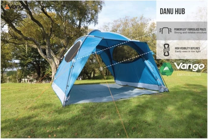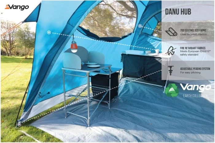 The Vango Danu Hub provides the perfect shelter for dining, socialising and gatherings. Using our new Sentinel Eco flysheet, the Danu is made from recycled single-use plastics and maintains the same strength and durability you can expect from Vango. The PowerFlex® fibreglass cross-pole design offers generous stand up height and stability. Integrated mesh panels offer increased ventilation while the over door canopy provides additional protection from adverse weather.