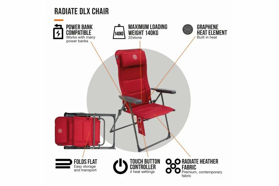 The Vango Radiate DLX chair is sure to keep you warm on the campsite as it features an innovative, built-in, Graphene heating element, allowing you to heat your chair when connected to a power source. Compatible with many power banks, the Radiate DLX seat will add a touch of luxury to your camping kit, with its high quality fabric, 7 seating options, padded seat and backrest, you will be the envy of other campers on those chilly evenings on the campsite.