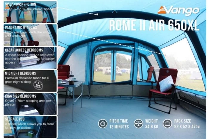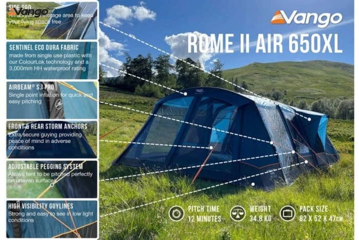 The Rome Air 650XL, 6-man inflatable AirBeam® tent will appeal to campers who like to be tidy and organised on the campsite. The side storage pod provides an excellent place for luggage and clothing. The integrated awning is ideal for storing your cooking and kitchen equipment. Open the large front doors fully and enjoy a sheltered spot for eating and socialising. Constructed from high quality Sentinel Dura fabric, the tent benefits from ColourLok™, 30% increase in strength and a 4000mmHH waterproof rating. With these features and more, the Rome Air tent will be at the centre your camping holidays for many years to come.