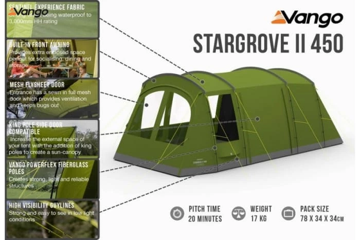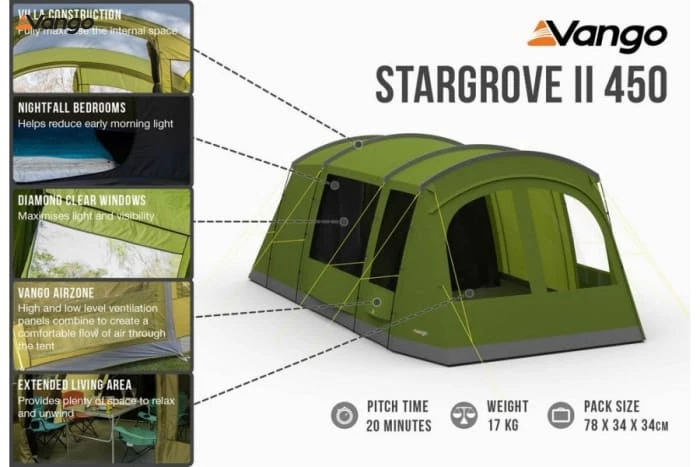 The Vango Stargrove II 450, 4-man tent has a fully enclosed, integrated awning offering great usability in all conditions. The large Diamond Clear windows let light pour into the living areas during the day and can be covered up with the roll-away toggled curtains at night. The fully sewn-in groundsheet keeps out draughts and bugs, whilst ventilation can be managed using the mesh doors and AirZone panels. At over 2m tall, it’s easy to stand-up and move around. The large front door can be unzipped to the midpoint, or fully across, giving a good variety of options to suit different conditions and uses. You can even sleep-in longer on summer mornings, thanks to the Nightfall bedroom inner tent, designed to minimise the morning light.