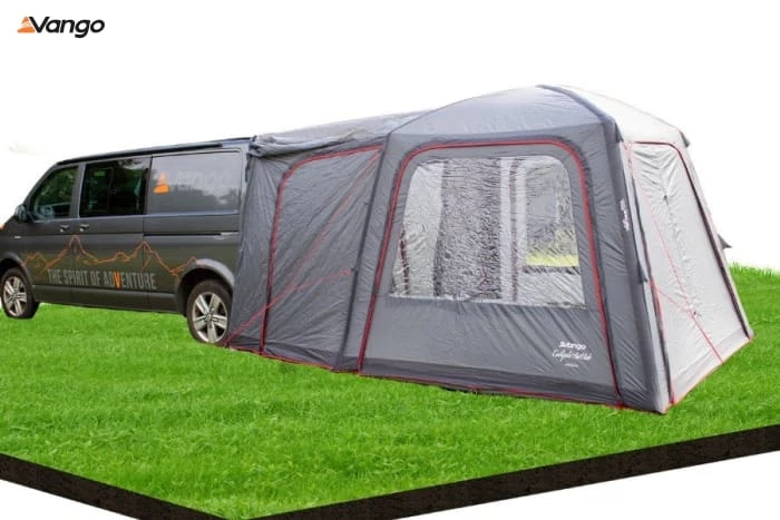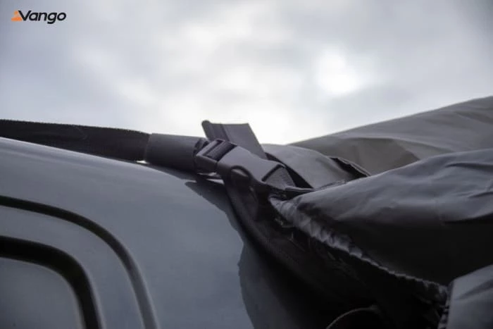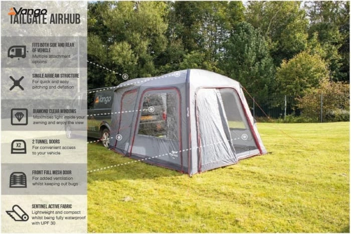Vango’s first rear attachment awning, the Tailgate AirHub is ideal for couples or independent travellers with a spirit of adventure. The perfect quick pitch for short stops, it has been designed with active adventurers in mind. The inflatable AirBeam® structure means this drive away awning is pitched in a matter of minutes and deflated just as fast. Effortless attachment requires only pegging straps at the front of the vehicle and tunnel area, allowing the awning to fit neatly without the need for kador rails. However, should you wish to use them, the traditional attachment options of roof bar attachment tabs, kador and a sleeve for pole and clamp are also included. Two doors in the connecting tunnel make for a convenient storage area, while Vango’s reliable and lightweight Sentinel Active Fabric, ensures a compact pack size, easily stored away when not in use. The Tailgate AirHub does not require the tailgate to be open to support the structure, so you can simply roll away the connecting tunnel when you want to drive off and explore for the day. Be ready for any adventure with the Tailgate AirHub.