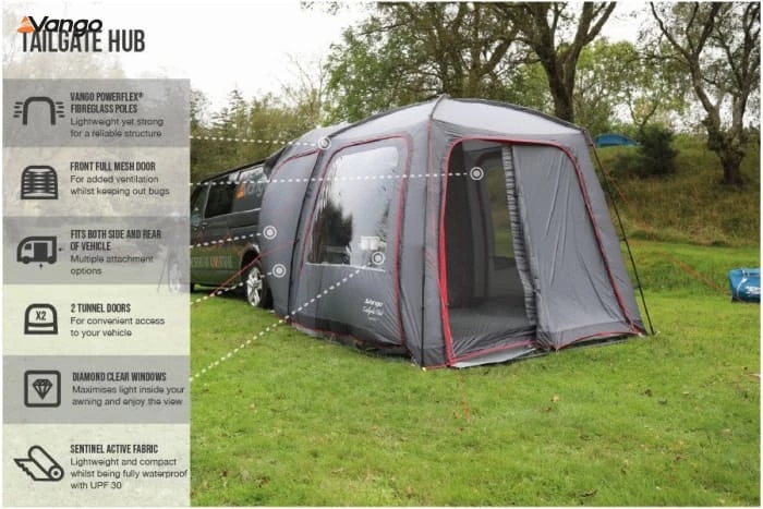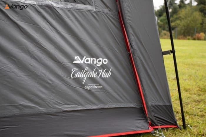 Vango’s first rear attachment awning, the Tailgate Hub is ideal for couples or independent travellers with a spirit of adventure. The perfect quick pitch for short stops, the Tailgate Hub has been designed with active adventurers in mind. Effortless attachment requires only pegging straps at the front of the vehicle and tunnel area, allowing the awning to fit neatly to your vehicle without the need for kador rails. However, should you wish to use them, the traditional attachment options of roof bar attachment tabs, kador and a sleeve for pole and clamp are also included. Two doors in the connecting tunnel make for a convenient storage area, while Vango’s reliable and lightweight Sentinel Active Fabric, ensures a compact pack size, easily stored away when not in use. The Tailgate Hub does not require the tailgate to be open to support the structure, so you can simply roll away the connecting tunnel should you want to drive off and explore for the day. Be ready for any adventure with the Tailgate Hub.
