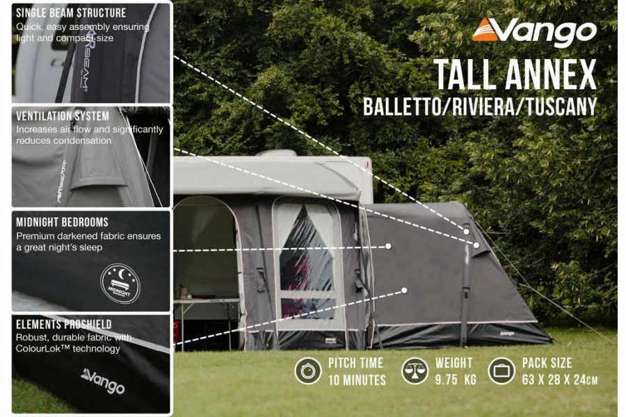 Expand your caravan awning with the Elements ProShield Tall annex, attached simply by removing the side door on the awning and zipping the annex into place. Perfect as a bonus storage area or for additional guests who come to stay. Premium Midnight Bedrooms make for a better night’s sleep that won’t be interrupted by the rising sun. A single AirBeam® structure and matching Elements ProShield Fabric ensure an easy pitch and a luxurious feel.