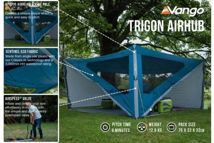 New for 2022, the Vango Trigon AirHub is the perfect shelter to congregate in as a group on the campsite, use as a central kitchen tent or communal shelter. The unique hybrid structure is designed with one central inflatable AirBeam® and two king poles at either side, creating a versatile event style shelter. With four opening sides, you can choose your door depending on the wind direction and mesh windows ensure you have added ventilation. Benefitting from our Sentinel Eco fabric made from recycled single-use plastics, the Trigon is the perfect place to relax in the outdoors whilst doing your bit for the environment.