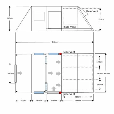 ► The light and airy living area has a fully sewn in main groundsheet to keep drafts and bugs away. Adjustable air vents with insect proof mesh panels are provided for comfort in warmer weather. The large tinted windows have adjustable privacy curtains and the bedroom section, which is made from a carefully selected black fabric, is divided into three compartments by way of removable partitions.